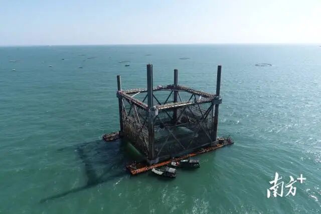 這些“圈圈”,近日又迎來了“新成員”。12月17日,作為茂名濱海新區(qū)大竹洲海洋產(chǎn)業(yè)園(海洋牧場類)一期項目重要養(yǎng)殖設備,“濱海牧1號”升降式桁架網(wǎng)箱拖航至既定海域。當天,海上施工隊伍對設備四條站樁開展下沉作業(yè)。未來兩周,他們將針對桁架網(wǎng)箱上的海洋附著物進行清理,并對網(wǎng)箱上機械系統(tǒng)進行設備維護。