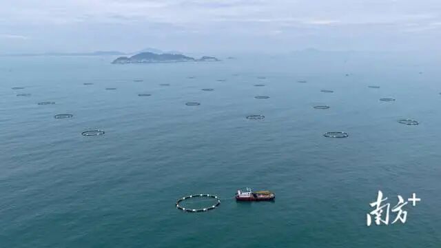 從茂名吉達港區(qū)東華能源重件碼頭起航,搭乘養(yǎng)殖運輸船,約1個小時就能抵達茂名大竹洲海洋牧場養(yǎng)殖區(qū)。從高空俯瞰,數(shù)十個深水網(wǎng)箱排列在海面,蔚為壯觀。